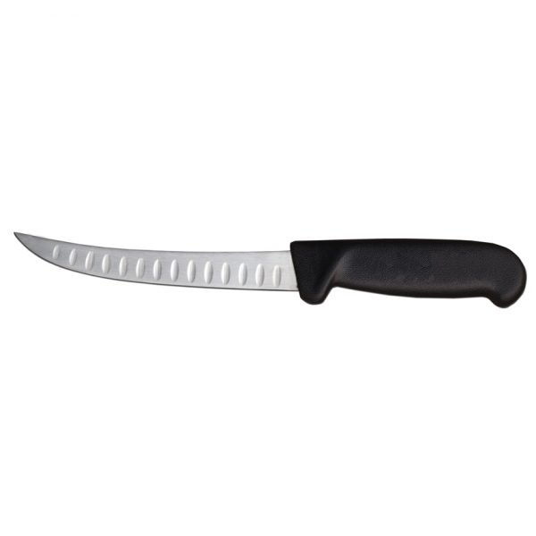The blade of a boning knife is thin and short, it is made to slip easily between the flesh and bone while cutting. Proper use of a boning knife allows you to quickly de-bone meat and increase your yield while reducing waste.