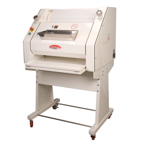 The BakeMax BMFBM01 French Bread Molder is perfect for the production of baguettes, finger rollers, long-loaves, petit pans, hot dog buns and various other sized breads. The BMFBM01 sheets through a series of three rollers and the progressive extension of the loaf is accomplished between two conveyor belts running in the opposite direction at varying speeds. This allows for gentle dough handing and a “hand-made” effect. This moulder will consistently produce uniform bread loaves ranging from 50 – 1000 grams / 1.76 – 35.27 oz and can produce up to 3000 pcs / hour.