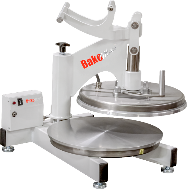 The BakeMax BMDMS-2-18 is an economical dual-heat dough press with versatility in that it can be used with dual-heat or no heat, making it the perfect choice for all types of products. This manual dough press is ideal for low to medium production volumes (75-100/hr). It is a fast, safe, simple, mess free (no flour needed) alternative to hand tossing or sheeting/rolling your pizza dough. The dough press is an easy, affordable way to improve your production time, as well as your finished product. The BakeMax BMDMS-2-18 is a swing away design with an upper heated platen.