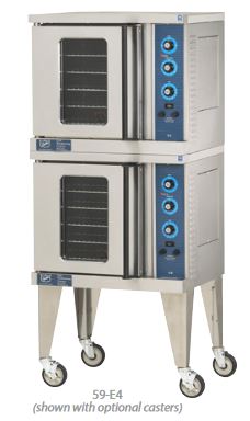 The Duke 59-E4 double convection oven consists of two half-size decks. For durability in high-volume environments, this unit’s exterior is constructed of stainless steel. It’s mounted on legs that stand 16 inches tall, elevating the ovens to a convenient height for cleaning and servicing.