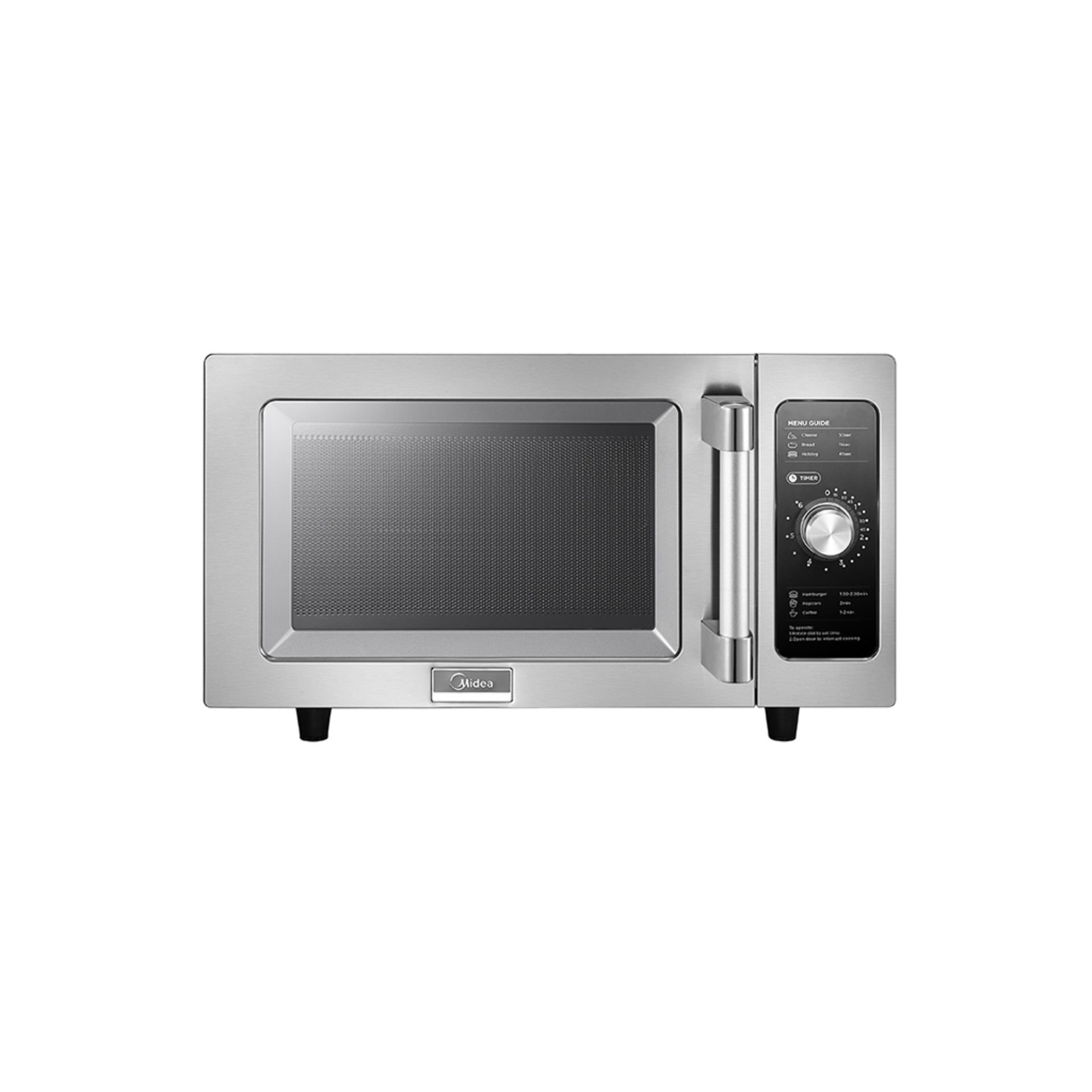 Light duty Commercial Microwave Oven from Midea shall have a 6 minute dial timer with illuminated digits and end of cycle beep. Timer shall automatically reset to zero if the door is opened during operation. Oven shall have full power for simple operation. Microwave output shall be 1000 Watts distributed by single magnetron with a bottom rotating antenna. An incandescent light shall make the food be easily monitored without opening the door. The medium capacity 0.9 cubic ft. (25 liter) cavity shall accommodates a 12” (305 mm) platter or 6” ½ H or X Pan with cover. Durable door shall have an EZ Grab and Go handle with a 90°+ opening for easy access. Oven shall have a stainless steel exterior wrap, door, and interior cavity. Chef/Test Kitchen Support. Microwave oven shall be listed by UL, CUL and ETL SANITATION.