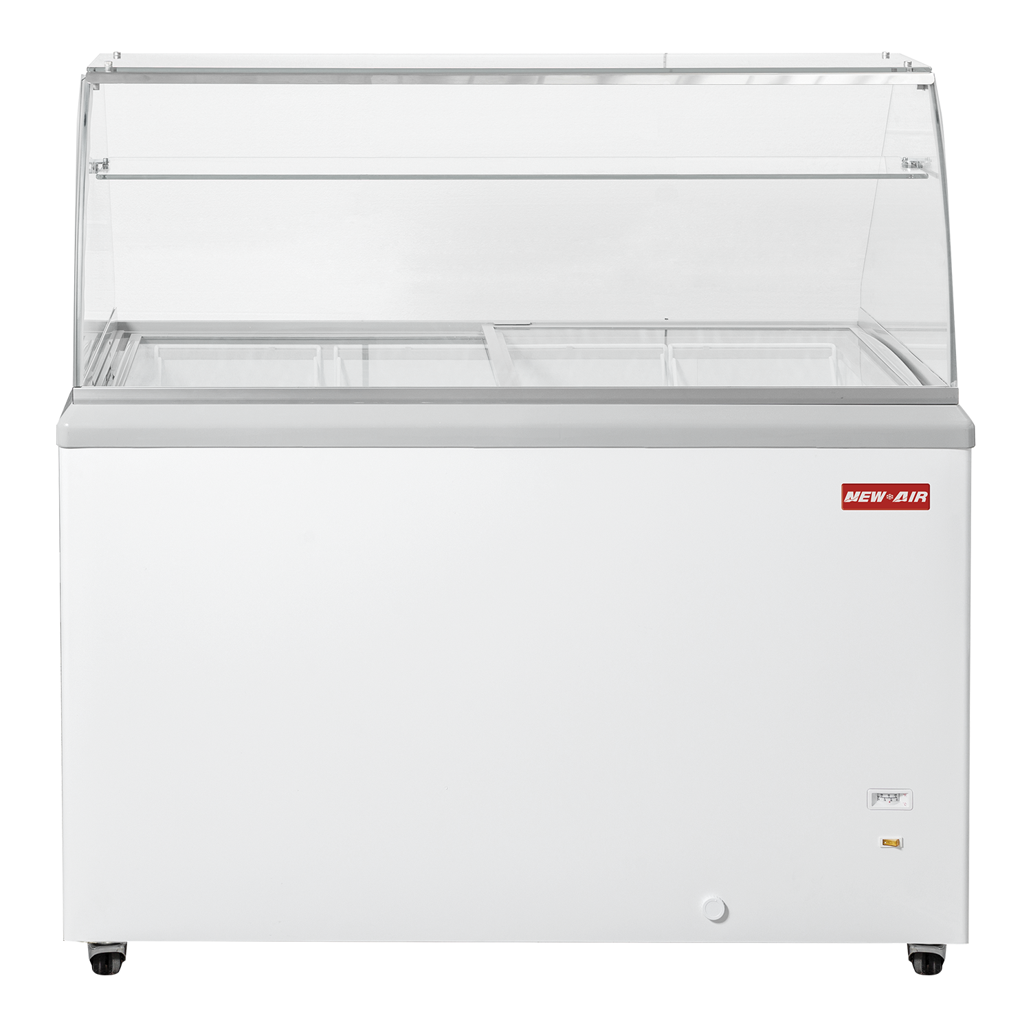 The NIF-50-DC ice cream freezer boasts a sliding flat glass design for easy viewing and access, 4 spacious wire baskets and an anti-condensation, anti-frosting design to keep all your frozen products fresh, cool and dry. Also includes an 18-inch glass canopy that allows customers to browse while keeping ice-cream free of germs. This freezer can an also hold 8 ice cream tubs for scooping and serving.