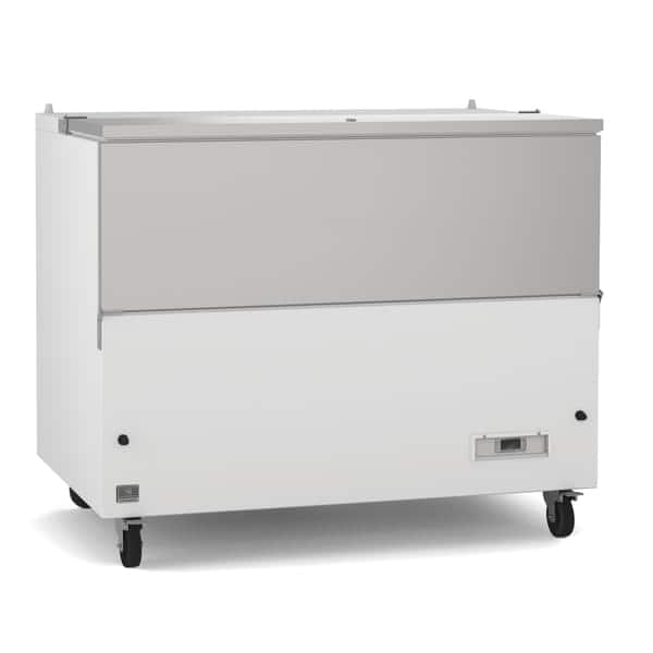 School Milk Crate Cooler, 48″W, self-contained rear mounted refrigeration, 19.6 cu. ft. capacity, stainless steel locking lid, +33/+41°F temperature range, stainless steel interior, galvanized & white painted steel exterior, casters, R290 Hydrocarbon refrigerant, 1/5 HP, 115v/60/1-ph, 0.2kW, 2 amps, NEMA 5-15P, cETLus, ETL-Sanitation