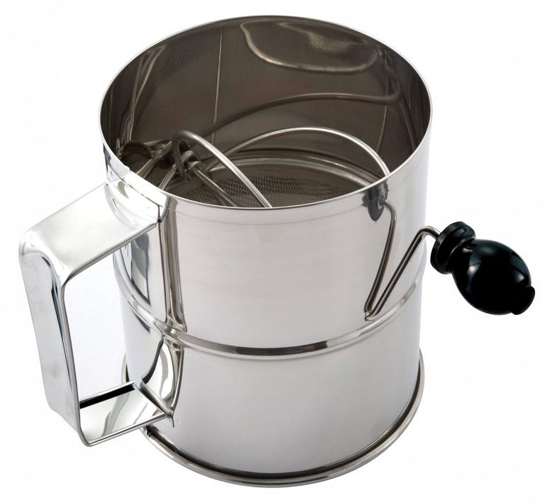 - This rotary sifter is made of professional stainless steel. It features an 8-cup capacity with wire mesh reinforcement.