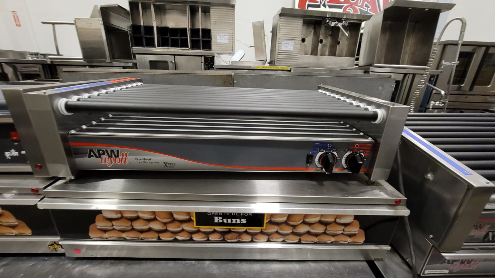 UNUSED APW HOT DOG ROLLER WITH BUNS WARMERS