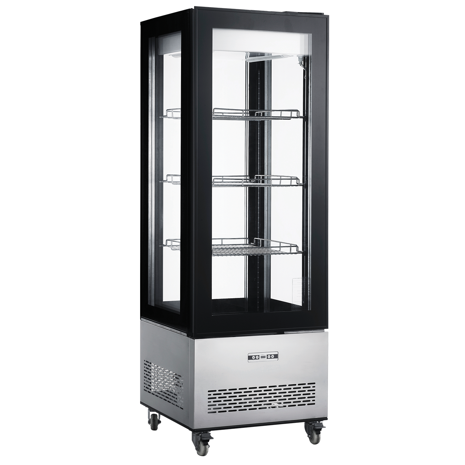 The NDC-040-SS refrigerated display case is an ideal fit for restaurants, cafes, convenience stores and supermarkets. Easily display your products in a vertical panoramic case on 3 adjustable chrome-plated shelves or optional wine shelving that is perfect for wine bottles.