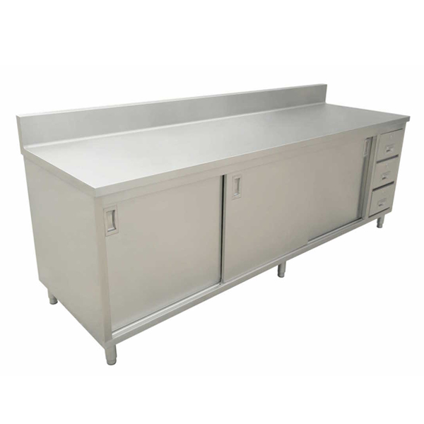 Worktable with Backsplash, Cabinet, Drawers, and Sliding Doors